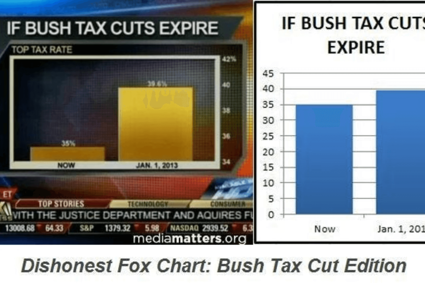 In 2009, Fox News aired a bar chart showing the effects of tax cuts. Sounds simple, right? However, the chart manipulated the Y-axis, exaggerating minor differences in tax policy to make them appear monumental. By starting the Y-axis at a number higher than zero, they made minor changes look massive.