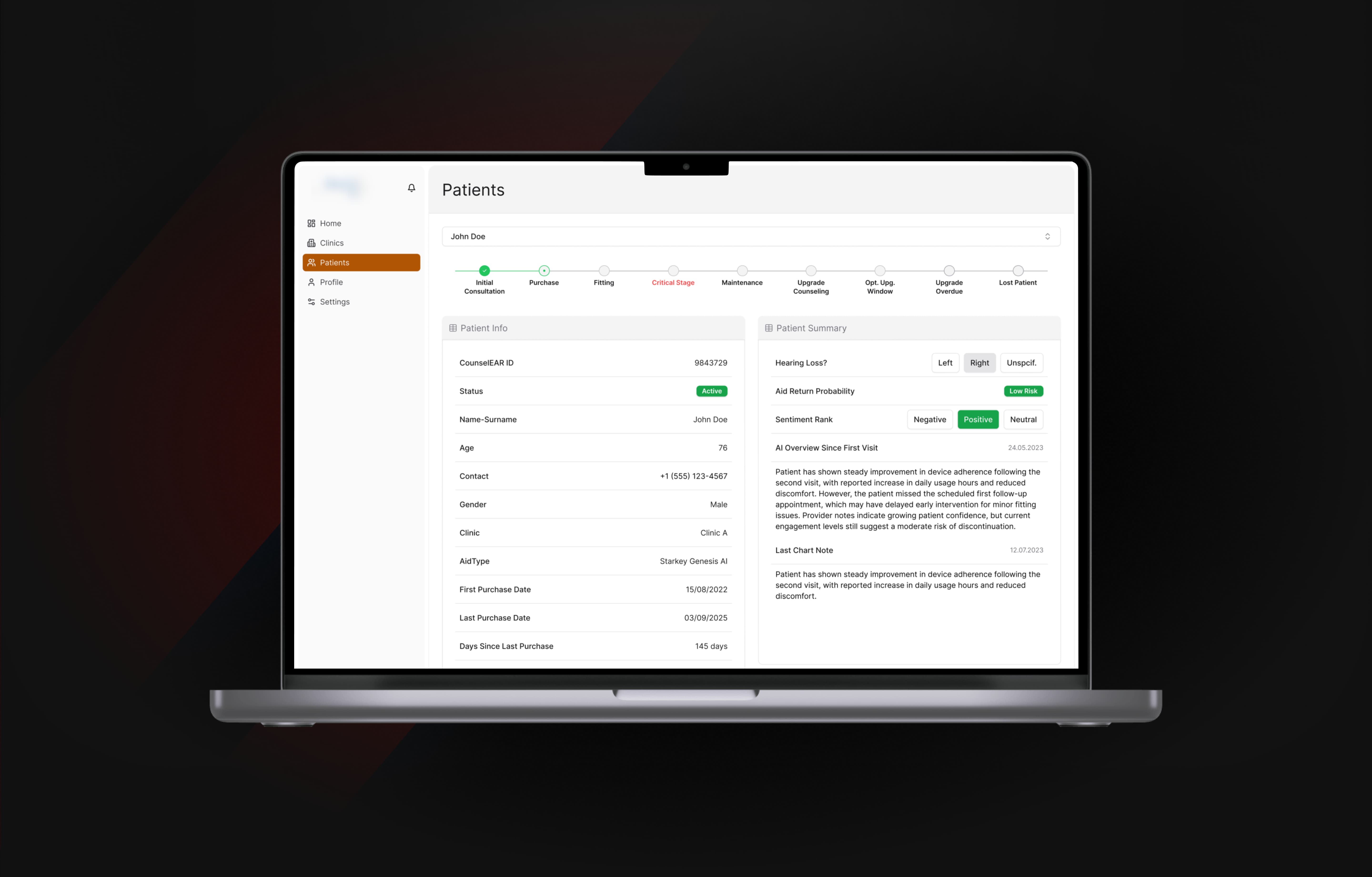 To develop an AI-powered analytics and prediction platform that consolidates patient and hearing aid data, predicts at-risk patients, and provides actionable insights to improve care quality, retention, and operational efficiency across all clinic locations.