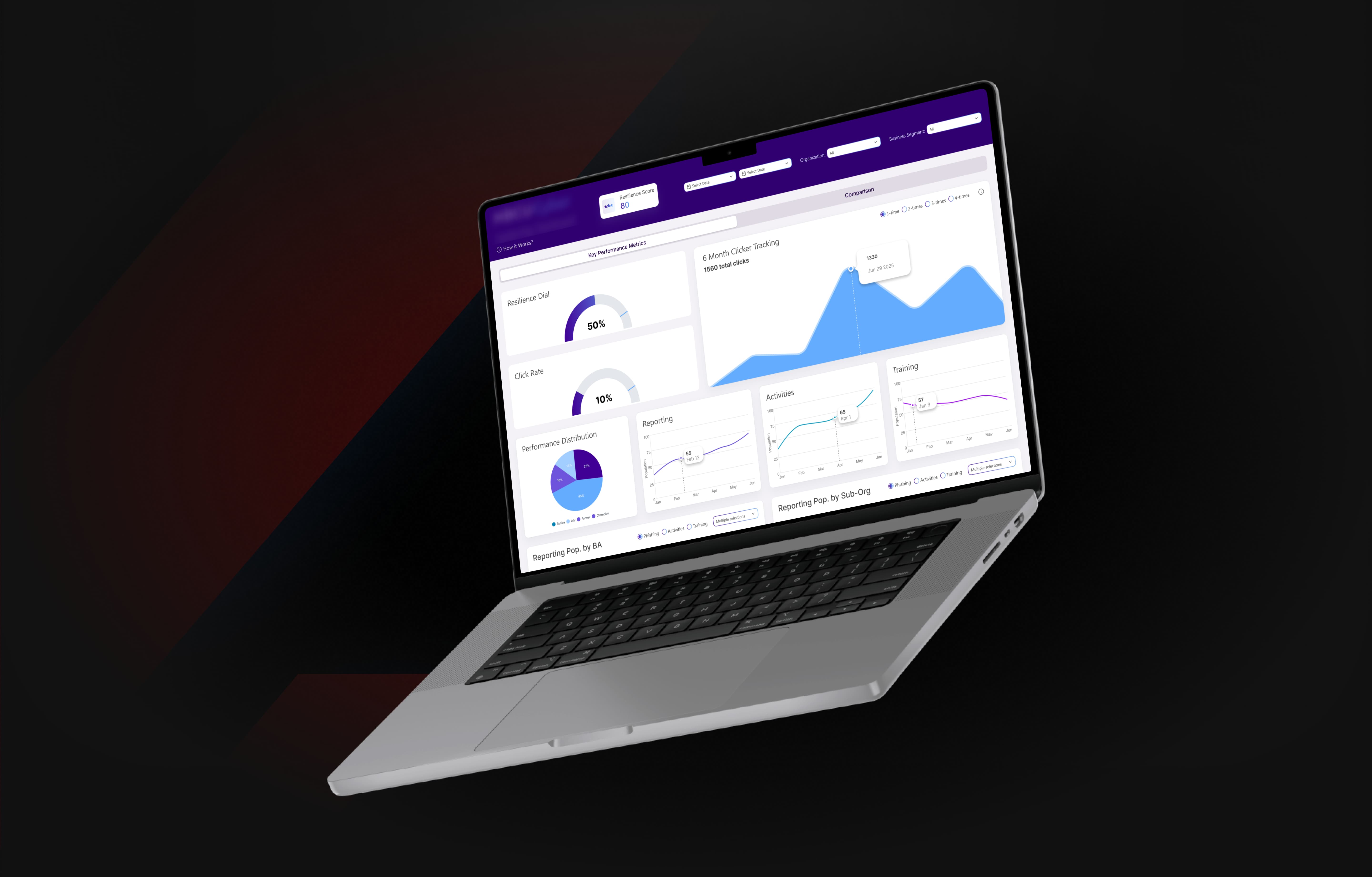 Configured segmented dashboards for executives, security analysts, and department heads, along with automated alerts for threshold-based anomalies in phishing behavior or training completion rates.