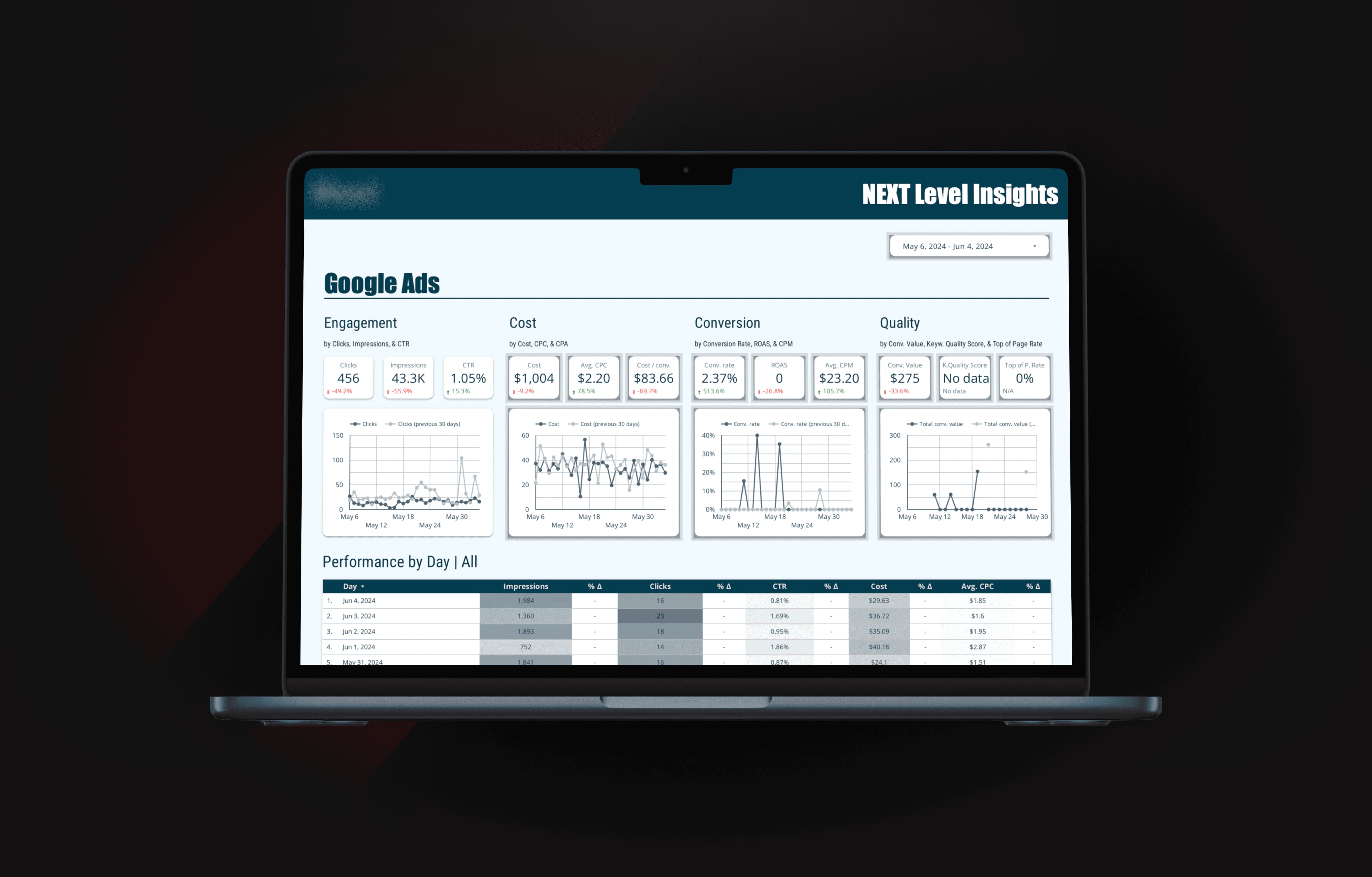 We developed a Looker Studio dashboard template that automatically connects and aggregates data from multiple marketing platforms—Google Ads, Meta, and Google Analytics—removing the need for manual data pulls or spreadsheet manipulation.