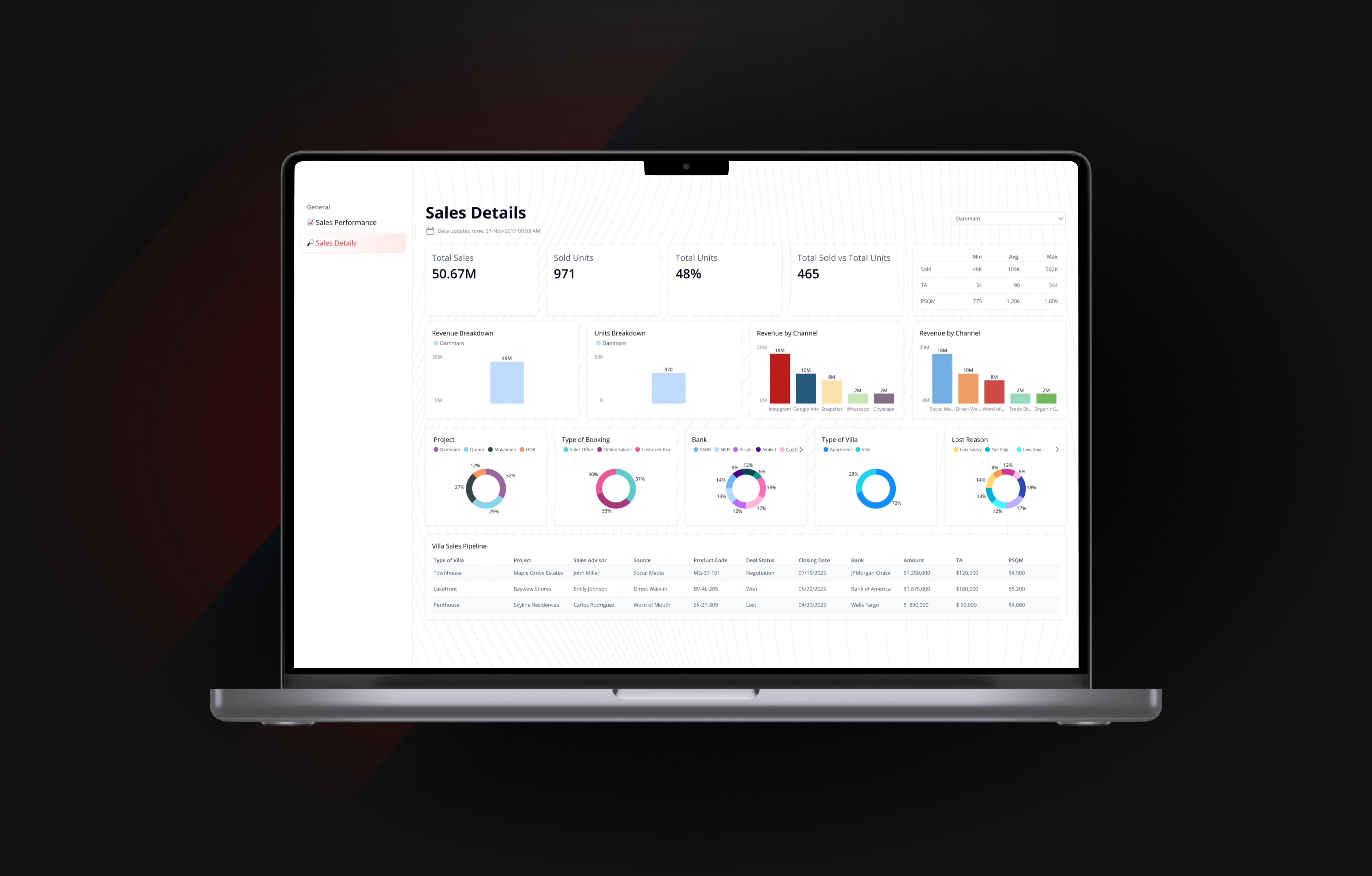 Developed dynamic dashboards visualizing key KPIs—lead-to-sale conversion, marketing ROI, and project pipeline progress—with automatic data refreshes and interactive filters.