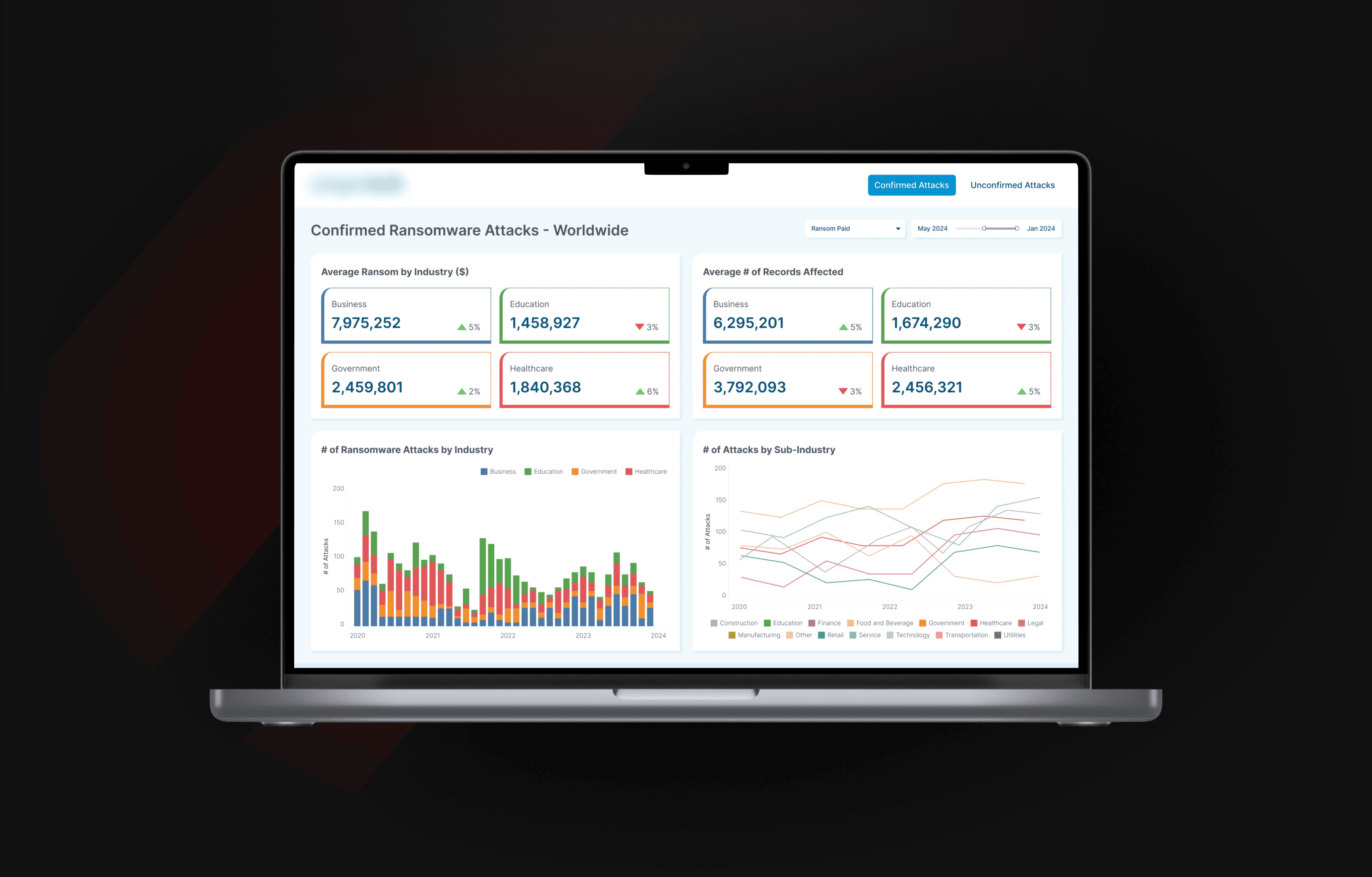 A clean layout emphasizes key KPIs—attack counts, average ransom amounts, and geographic heatmaps—while offering drill-down filters by industry, region, and time window. Contextual tooltips and alert badges guide users to critical insights without overwhelming them.